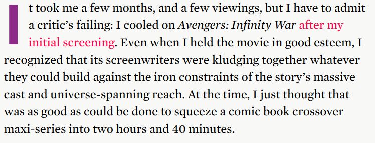 Keeping it vague because of spoilers but my reservations about Endgame are building up as I reflect on it. I still think it was narratively satisfying - which I wasn't convinced it would be after Infinity War - but it didn't do the things that I would have liked it to do.