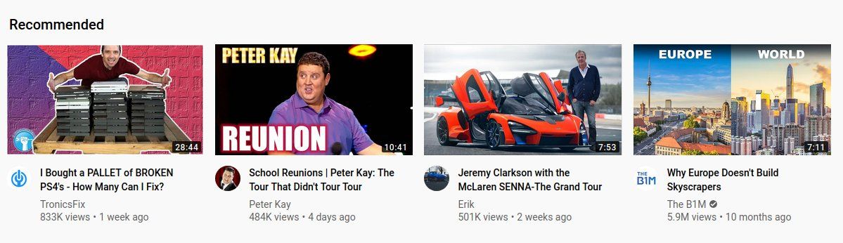 The biggest incitement to turn on YouTube recommendations has been turning off YouTube recommendations. I currently see this shit every time I go to the website.