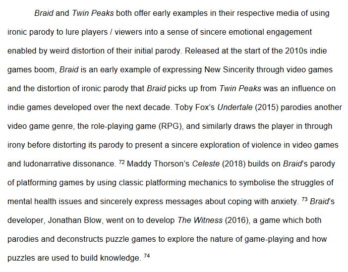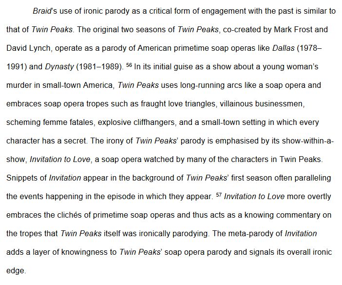 The first chapter looks at Braid (2008) and Twin Peaks (1990–1991) focusing on postmodernist parody: Braid as a parody of Super Mario Bros. (1989) and Peaks of American soap opera. I was pleased to focus on Invitation to Love and Peaks' parody as I feel that's undertheorised.