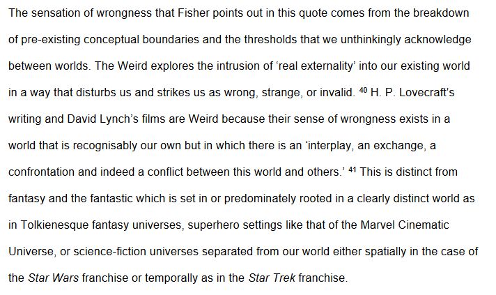 The definition of the Weird is substantially based on Mark Fisher's work and his focus on the blurring of conceptual boundaries in this subgenre.