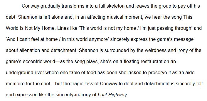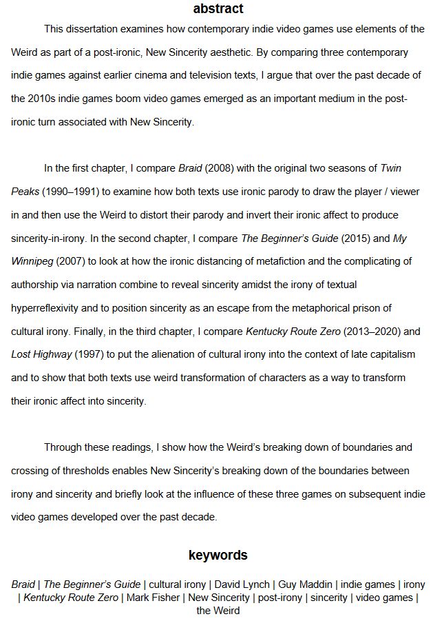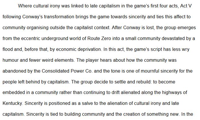 Finally, chapter three compares @cardboardcompy's Kentucky Route Zero (2013–2020) to David Lynch's Lost Highway (1997). In this chapter, I gesture to broader concerns about late capitalism and how cultural irony is in some sense a symptom of late capitalism.