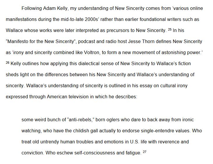 For my definition of New Sincerity, I reject the pre-ironic conception of David Foster Wallace (who nonetheless is a strong influence on the dissertation) and opt for a dialectical sense of blending irony and sincerity (informed by @JesseThorn).