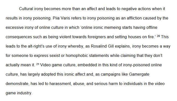 This part on irony poisoning and the actual harm that irony leads to cites Piia Varis and Rosalind Gill.