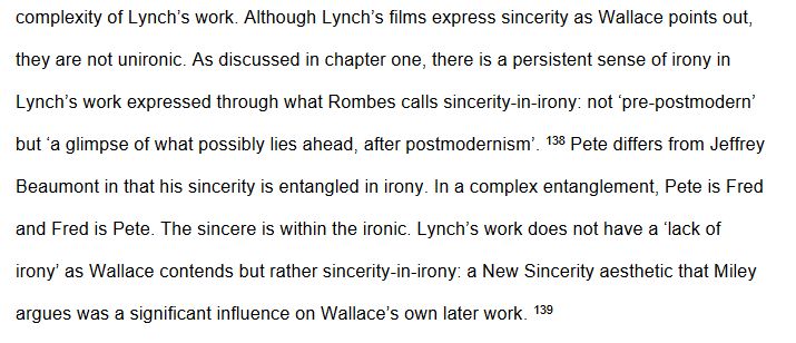 I've been hugely influenced by David Foster Wallace's treatment of irony and sincerity and so it was something of a surprise how much of this dissertation was spent refuting him and arguing that his interpretations of e.g. Lynch are wrong on this score.