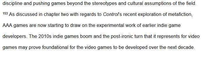 In the conclusion, I sum up by writing about how contemporary indie video games challenge the cultural irony of mainstream video games culture and how their post-ironic turn may prove foundational for video game development over the next decade.