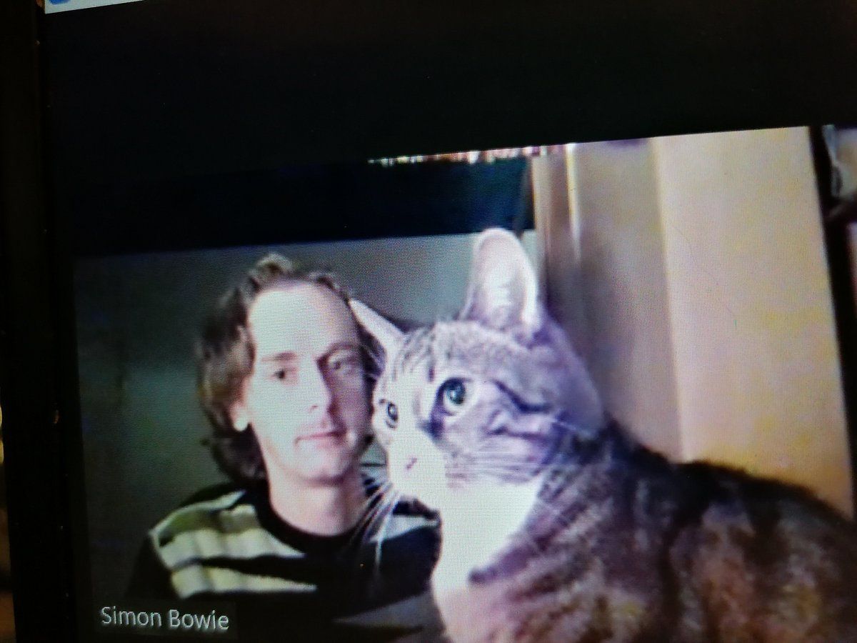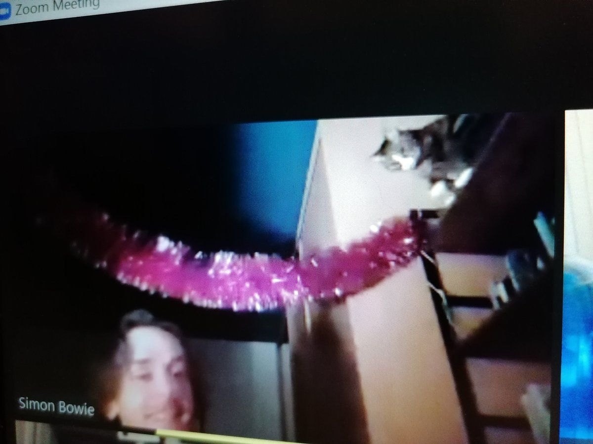 /Trying/ to video chat with my friends but /someone/ wants some attention / tinsel.