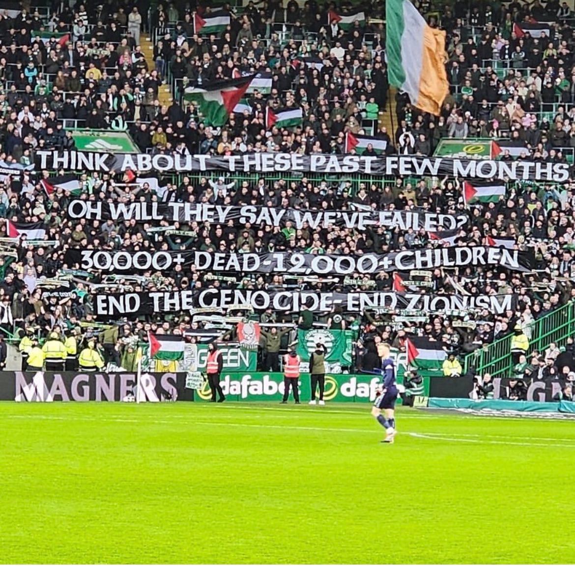 : Celtic Park, Glasgow today “30,000+ dead, 12,000+ children End the genocide. End Zionism.”