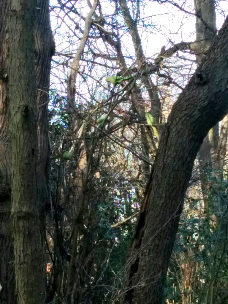 While out walking in Beckenham Place Park. A whole family of wild London parakeets.