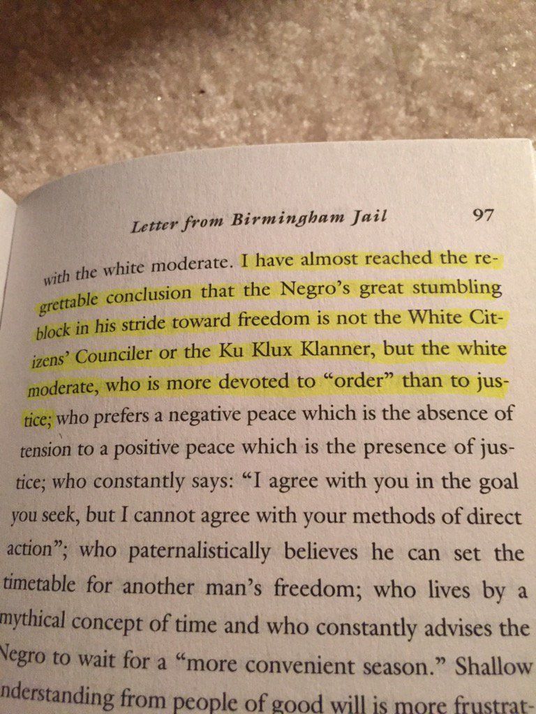 : MLK talking about how the white moderate is more dangerous to freedom than the KKK.