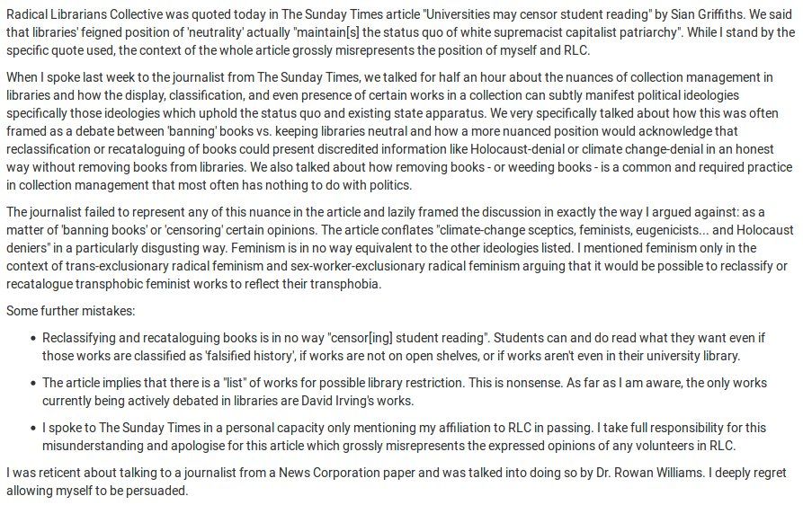 So @RadicalLibs was quoted today in a bad article in The Sunday Times. This was my fault and I apologise for the misrepresentation of RLC.