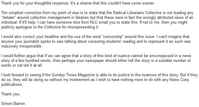 The Times is publishing a correction regarding @RadicalLibs' involvement in recataloguing and reclassifying books. They won't apologise to either me or the Collective. They know what I'm angry about but they don't care.