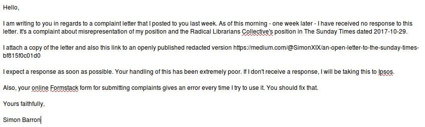 1. One week later and @thesundaytimes haven't responded to my formal complaint at all. Not even an email. @SimonXIX/924962730737627136