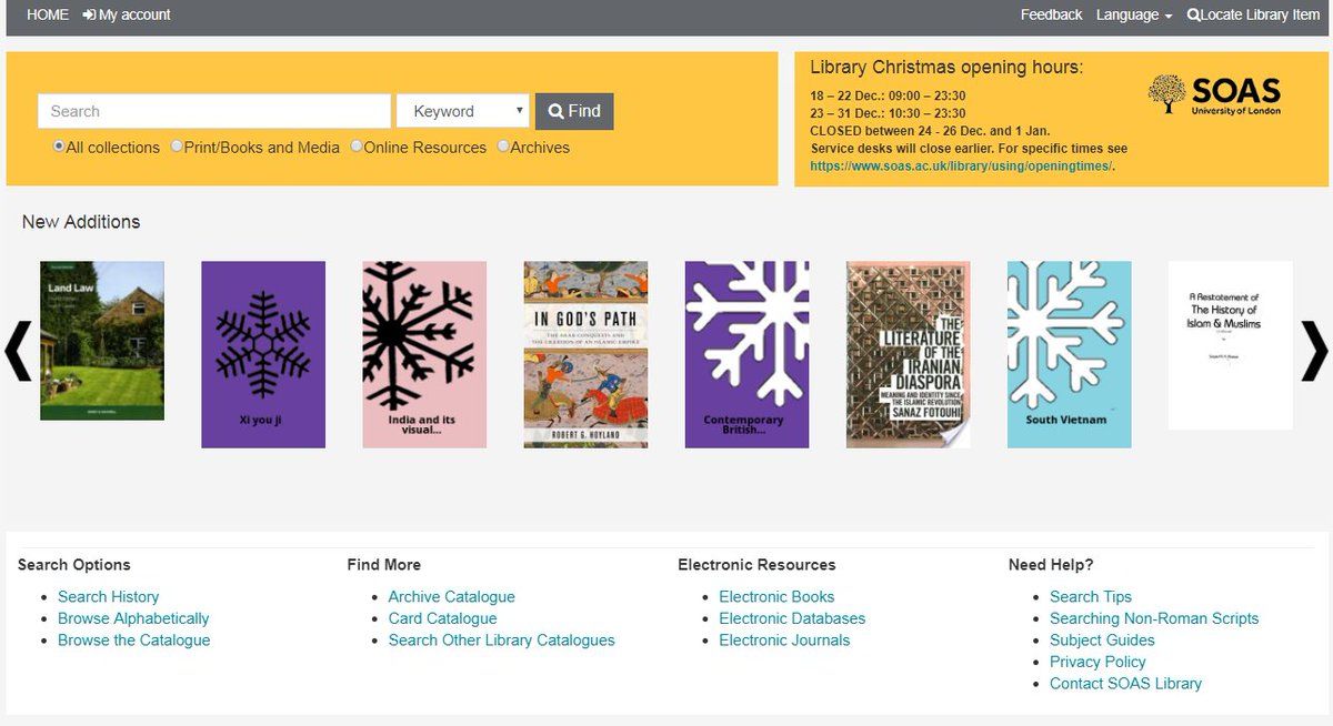 We've marked the season on the library catalogue in an understated way by changing the no-cover cover image on our new books carousel from Soas leaves to lovely snowflakes.